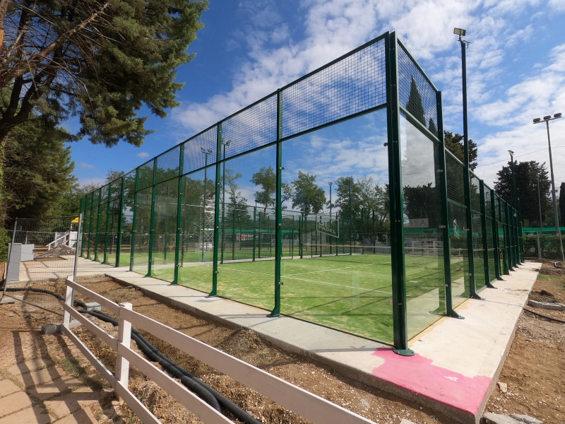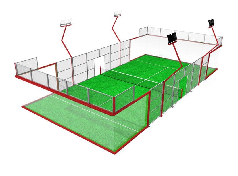 Ferro zincato in origine OUTDOOR, una volta prodotta la struttura, successivo trattamento di: sgrassamento, fosfatato e lavaggio con acqua e acqua osmotizzata. Laccato in forno con applicazione di pittura in polvere di poliestere mediante sistema automatico di pistole elettrostatiche e posteriore polimerizzazione a 220° C., seguendo la normativa della Federazione Internazionale Padel. Colori struttura “Amaranto” RAL 3013. Composta da pannelli in rete elettrosaldata e profili di rinforzo. Compresi n. 4 pali a “Z” per l’illuminazione con relative “T” per ancoraggio proiettori (non compresi). Spazi di entrata idonei per il gioco EXTREME. Fissaggio dei telai con bulloneria zincata, ancoraggio con viti ad espansione e sistema di tensione della rete.