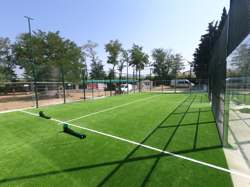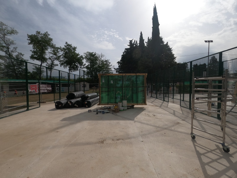 Autoportante con colonne in acciaio, Profilo 80x60x2mm, rinforzato tra la piastra di ancoraggio e la colonna. N.18 telai 2000×3000 completi di vetri, n.14 telai 2000×1000 e n.10 telai 3000×2000 tutti in maglia elettrosaldata 50x50x4, n.4 telai da 2000×3000 per accesso al campo senza porte (2 entrate in ogni laterale del campo), il tutto verniciato, colore a scelta, piastre di fissaggio con bordi arrotondati con l’utilizzo di borchie tipo Hilti e viti zincate, completo di pali predisposti per l’illuminazione.