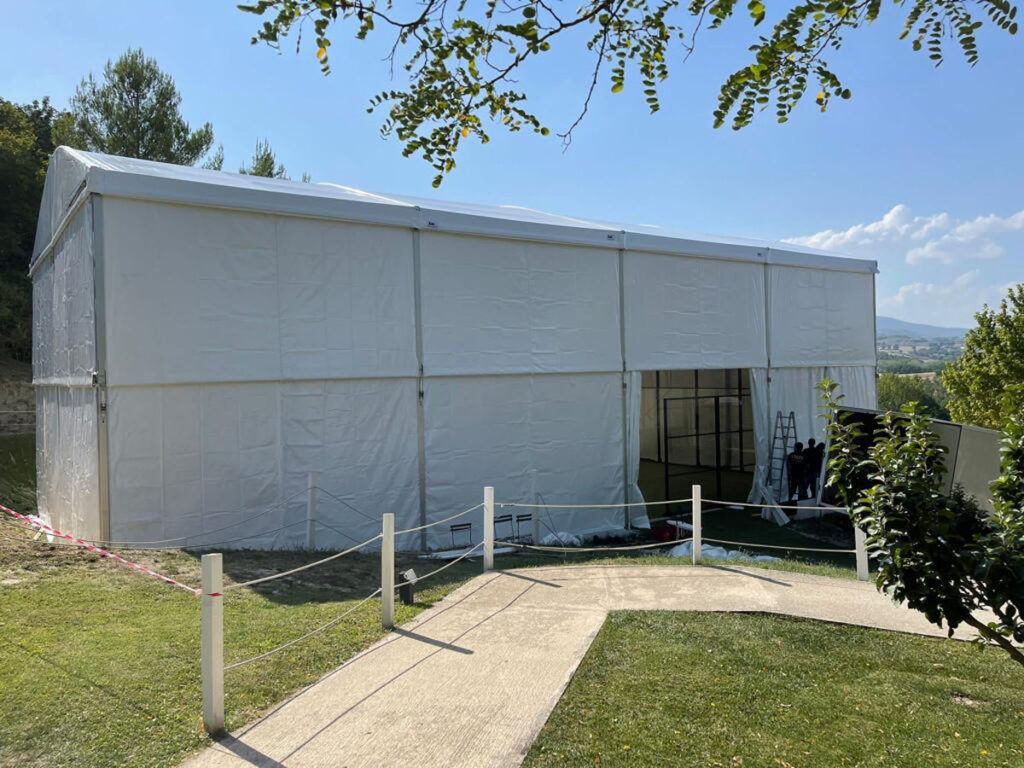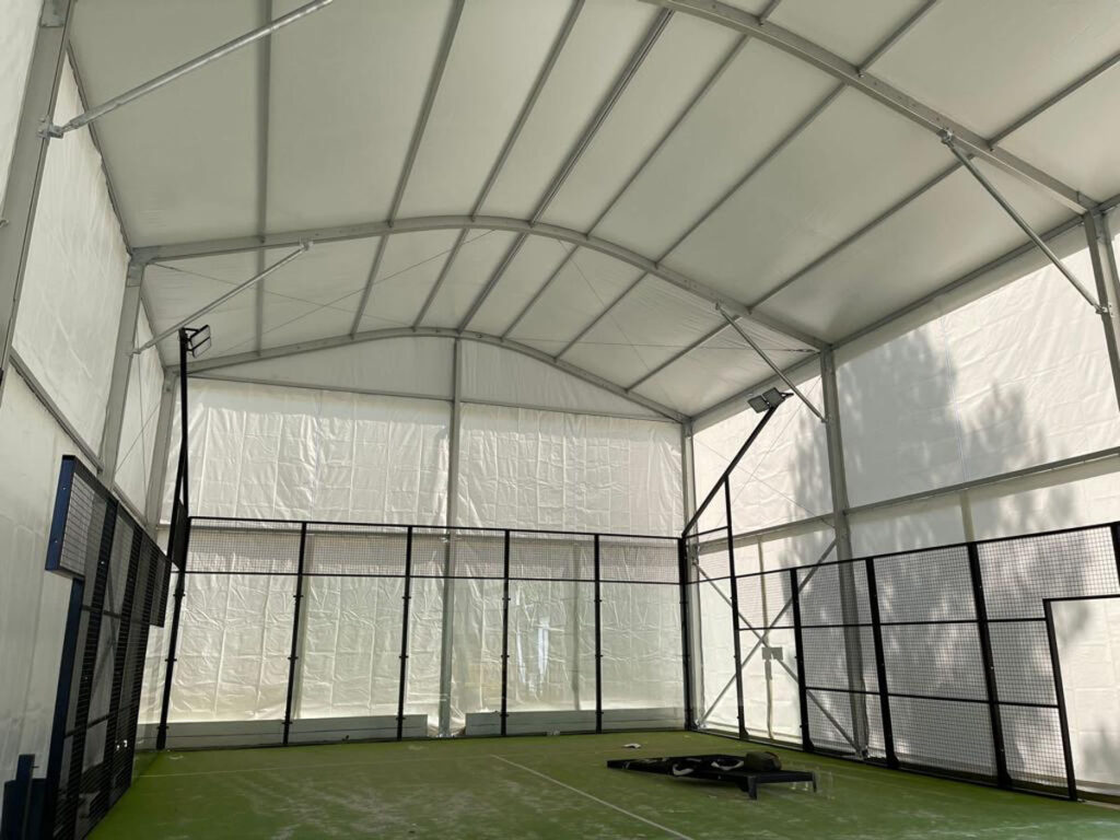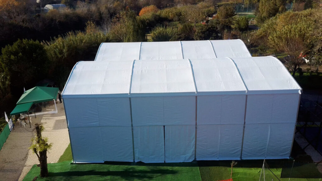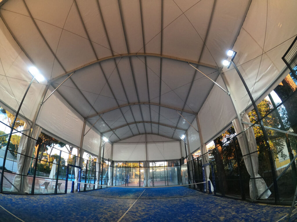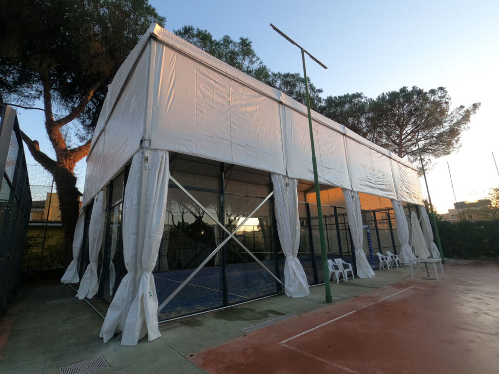 Struttura: Realizzata con struttura in alluminio anodizzato, profilo principale da 203x109x4mm, ancorata a terra con l’utilizzo di stopper tipo fischer su piastra. Possibilità di coprire solo un campo da padel 10×20 altezza laterale 7m, altezza massima 8,3m con relativo disegno tecnico Possibilità di coprire più campi da padel 22×41 altezza laterale 6m, altezza massima 12m con relativo disegno tecnico Struttura in rispetto della norma UNI EN13782 Copertura: La struttura è copertura con telo in PVC oscurante bianco da 850gr/mq per la copertura superiore e da 650gr/mq la copertura laterale fino all’altezza dei vetri (con possibilità di coprire fino a terra), il tetto è apribile manualmente Resistenza al fuoco dei teli: Classe 2